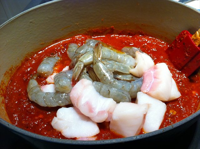 5. To cook the seafood, 10 minutes before serving add the cubes of fish and the prawns to the red sauce. Don’t let the sauce boil, just pop the lid on and let them gently poach until the prawns are pink and the fish is opaque.