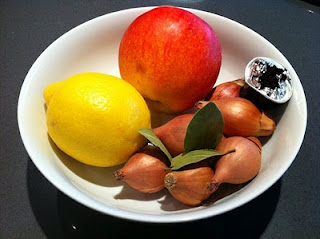 3. Add the peeled eschallots, bay leaves strips of lemon zest and slices of apple (skin on is fine). Sautee them for 2 minutes so the onion starts to soften.