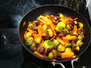 Blackened brussel sprouts and carrots go quite well with pork . Even The Flavour Thesaurus tells me so.