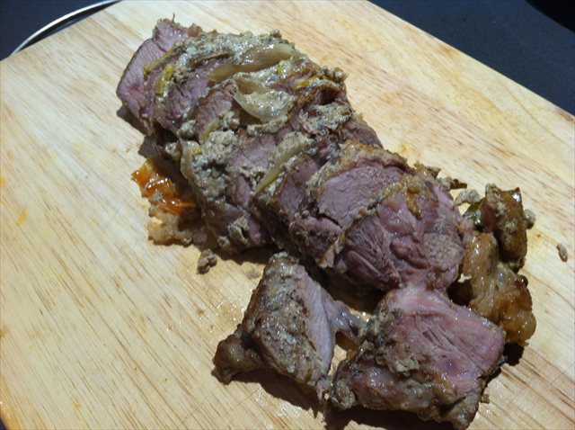 9. Serve the sliced meat and a ladle of the coffee/curd sauce with the onions warm mashed white beans or potato, with some roasted vegetables on the side.