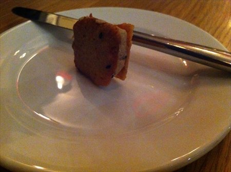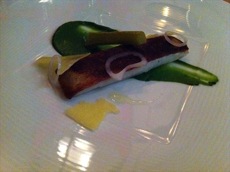 Here’s another thing I like. Agedashi tofu. I’ll always order it in a Japense restaurant and not just for the novetly value of watching bonito flakes dance. So there’s another good reason why I loved the next . It’s a puree of smoked eggplant, topped with the clipped helmets of enoki mushrooms, softly confited salmon and griddled eggplant. A moat of agedashi stock is floated around it all.