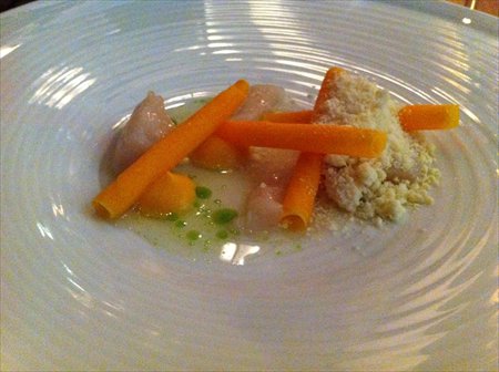 The first dish we face is light and curious. Raw scallops, pumpkin puree and a frozen snow of mustard. Puddling about below is a pumpkin consomme split with rocket oil.