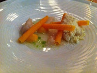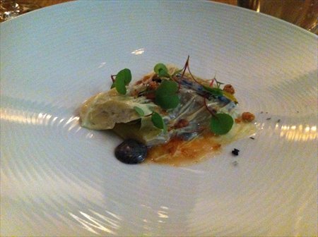 It’s a restrained symphony-the sweetness and salt in all waltz around holding hands. It’s here that we realise how inspiring Viajante’s wine pairings can be . We’ve made our way so far through a crisp and clear Australian riesling and some Gruner Vetliner. Here, with this very Japanese dish it’s a rose from 2000. It’s aged so it sweeps across your mouth like a dry sherry and lets the other flavours dance at the front. Very clever stuff.
