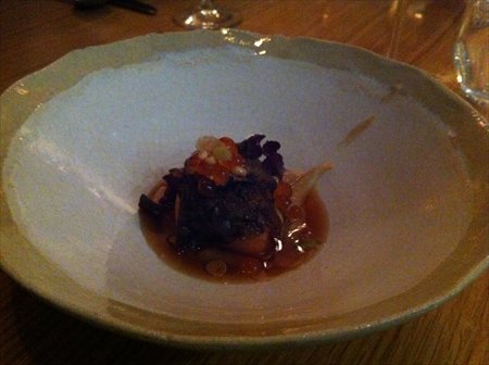 That is the exact opposite of what comes next. It’s a bonus course, we think, after we discovered a mutual friend working in the kitchen. It arrives on warmed rocks- a novelty in itself. Layered above, like good things found at the base of a fire is a buttress of smoked rosemary. Over that is a beautifully sweet section of langoustine tail and a tanlge of enoki mushrooms, mysterious as mermaid tresses. Draped over that is a cape of lardo which softly melts. You pick it all up with your finger tips and gobble in one bite. I’m sure cavemen never had it this good.
