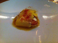 The seafood theme continues for the next couple of courses. A long rectangular sheet of potato is protecting hunks of lobster and roasted potato. Under that, distended like a pregnant belly is a poached egg yolk. When this is pierced it floods the plate, binding the stock into a lip sticking sauce.