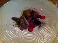 Viajante deftly avoids the formulaic paint-by-numbers appropach to meat so often seen in starred places. Like the traditions of a third or fourth ‘white fish filler course’ we’ve come to expect a presentation of meat + squish + sauce. Or, a ‘piece of sous vide and seared protein sitting on top of pureed vegetable, with a drizzling of butter heavy jus’