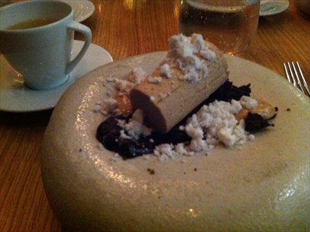 So the desserts that arrive firmly falls into the category of things they like. It’s plated on a grey stone, that looks like it’s endured a thumb print from a giant. In the curved centre is a log of hazelnut parfait. Around it are granules of coffee, hazelnut cream and dense chocolate cake. Over the top is a snorting of malt powder.