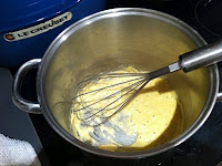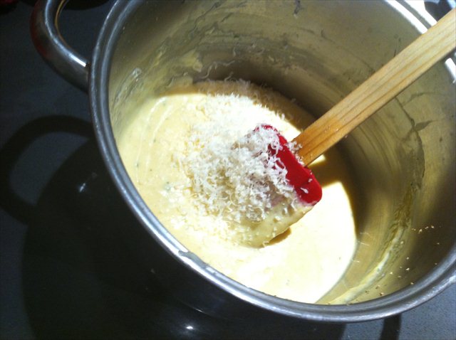 5) When the bechamel has cooled add the three egg yolks, the goats cheese, nutmeg, dijon mustard and salt.