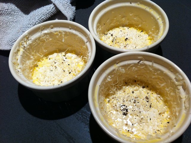 After twelve minutes in the oven they were ready. Zippy with cheese but soothing with egg. We dipped asparagus spears into their bellies and scooped the rest up with toast.