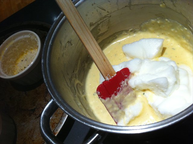 8) Fold the egg whites into the cheesey mix in two steps.