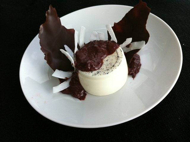 Drizzle the panna cottas with the chocolate and blackberry sauce.