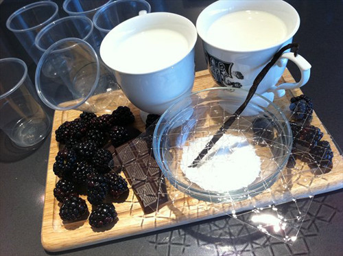 Fold the blackberry puree and the chocolate together. Warm the mixture in a pan or the microwave.