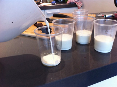 Pour the mixture into the six plastic cups. Let them cool and them place them in the fridge for 4-6 hours to set properly.