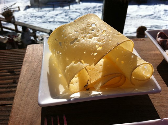 The mountain cheese is curled in repose and holey like a moth eaten jumper. It unfurls to pliable sheets that let the sunlight slake through. It’s nutty and sweet and the perfect foil for pickled onions and cornichons.