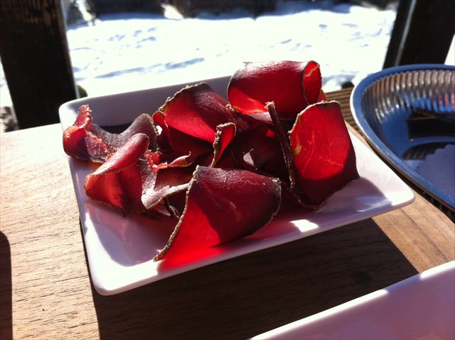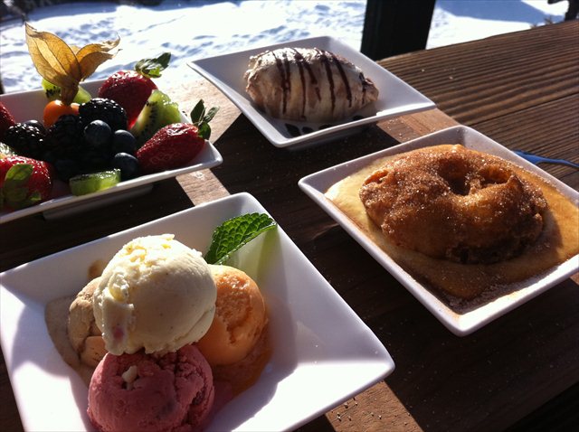The first day we visit (yes, we went back multiple times) we find ourselves tucked upstairs on the second floor balcony. It’s been a while since we’ve been skiing, so the first priority is celebrating that we got to the restaurant in one piece. It’s a glass of prosecco for me and a deservedly large wheat beer for The Hungry One. Three sips in and I’m remembering why I like skiing. Any sport that sanctions drinking at lunch is fine with me.