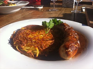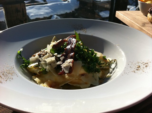 There are plenty of other appealing options on the menu for those wanting something a little more refined. The pastas, in particular are great. One day I carbo loaded at lunch with a plate of ravioli filled with mountain goat cheese, with caramelised Valais pear. Glistening over the top was some brown butter- and a surprise for any vegetarians who might order it- a crispy rasher of cured pig.