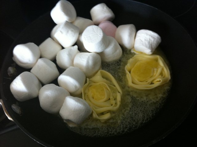 1. Put the marshmallows and the butter in a saucepan over a low heat. Stirring the mixture they’ve completely both melted. Remove from heat.