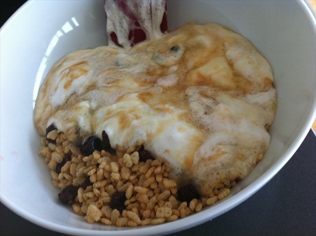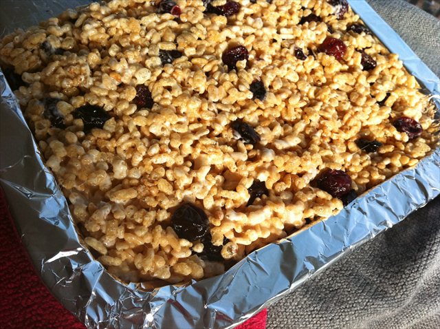 2. Add Rice Krispies and dried sour cherries. Stir until everything is well coated.