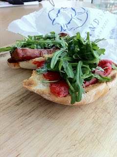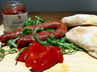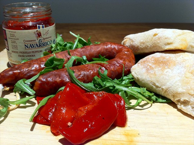 5. Place the piquillo peppers on the toasted roll. Add the chorizo and the rocket and close the sandwich.