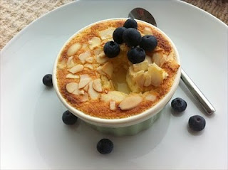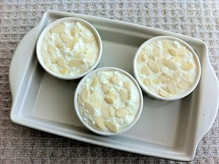 8. Lightly grease the ramekins or pudding dish. Pour the mixture into the ramekins/ pudding dish and top with flaked almonds.