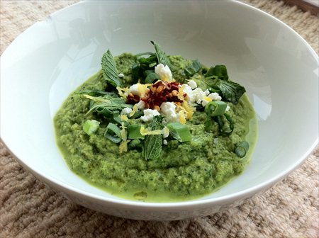 10. To serve, heat the soup up and emulsify four tablespoons of good quality olive oil through it before serving. Top in individual bowls with the remaining soft green sections of scallion/ spring onion, mint leaves, lemon zest, goat’s curd, as much chilli as you like and don’t forget to be generous with the salt and pepper.