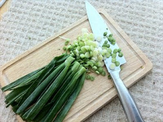 1. Slice the white stems of the spring onions thinly. Then sauté them in two tablespoons of olive oil.
