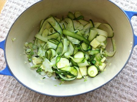 3. Create ribbons or small segments from the zuchinni. Add them to the casserole dish.