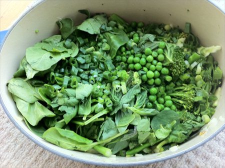 6. Add ¾ of the bunch of mint, the picked basil leaves, peas and hot stock.
