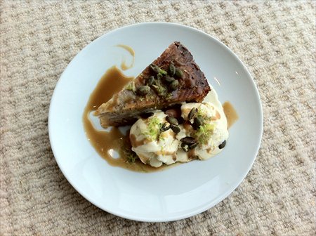 The pudding is best served warm, with warm caramel sauce, cold ice cream, a sprinkling of lime zest and a handful of spiced nuts for crunch.