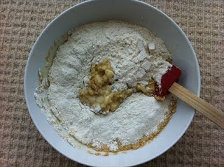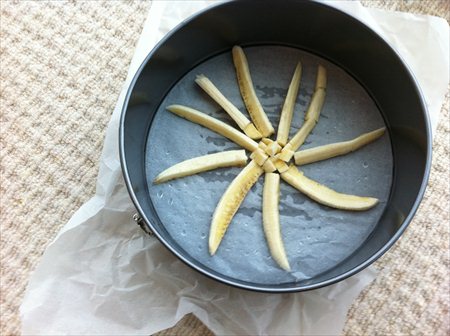 2. Decorate the bottom of the baking tin with long slivers of banana to make a pretty flower pattern.