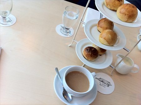 Between 3pm and 5pm the bar serves ‘buns’. But not just any buns- perfect ‘buttock shaped buns’. They come freshly baked on a gleaming cake stand. There’s one filled with a salty puree of anchovies, another with the childishly soothing texture of spiced prunes and a third which erupts with molten black chocolate.
