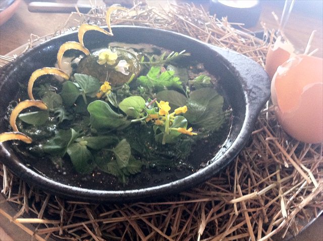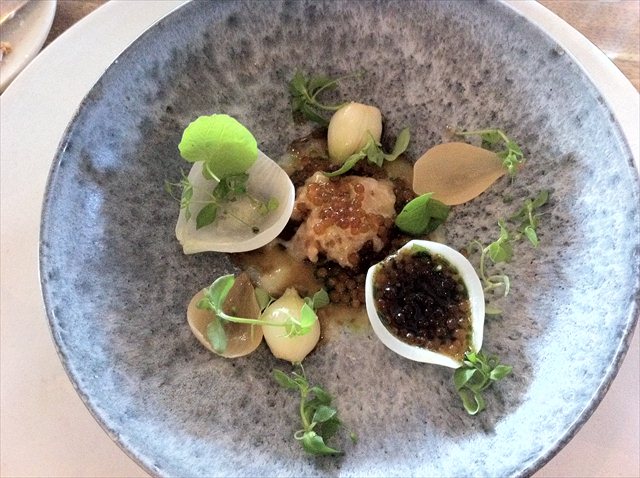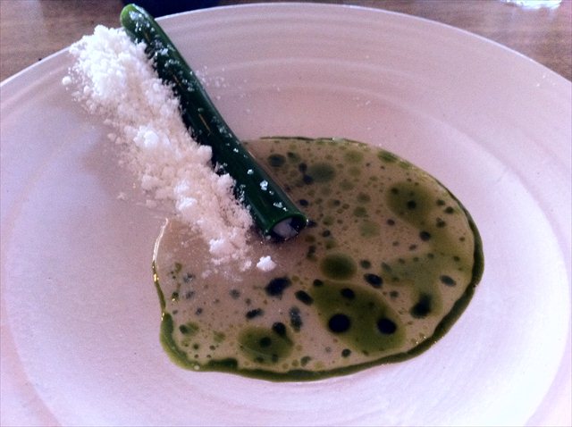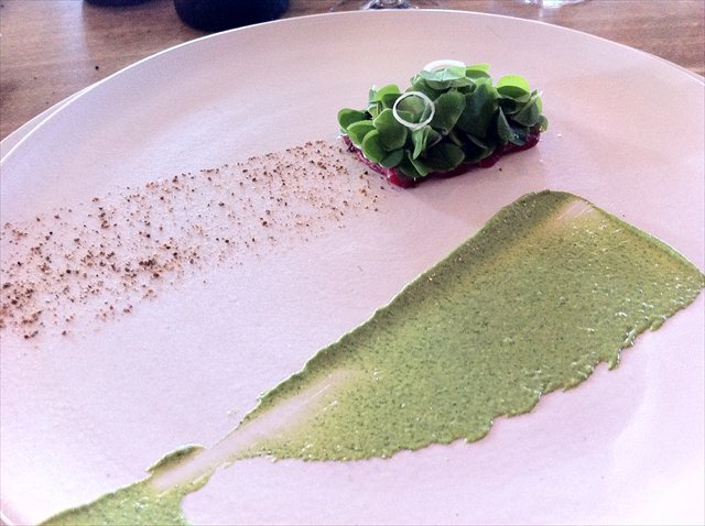 The next vegetable course is a hunk of celeriac that’s been cooked for an hour and a half in goat’s butter, and charred on the outside. Over the top is a Jack and the Beanstalk arrangement of watercress and two types of sorrel. Against the soothing combination of white and green is a swamp of Swedish summer truffles.