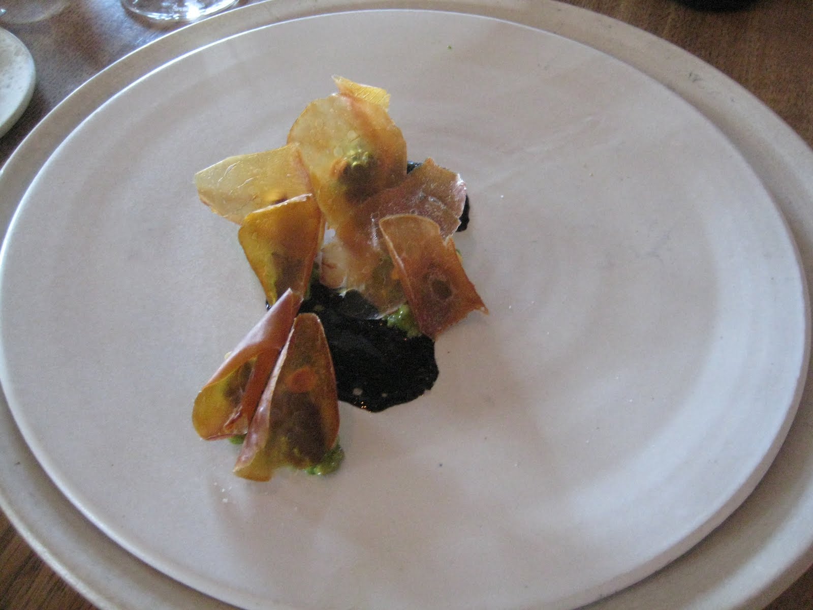 The seafood theme continues with a plate of crisps, standing tall like scraped fish scales. It’s a salad of toasted grains with squid ink and a watercress puree.