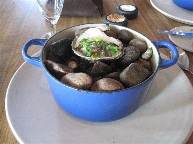Our time with the sea continues with a sizable blue Le Crueset cast iron pot. The inside is stacked with stones and shells. Balancing ontop of that is an oyster that’s been poached until it gleams opaque. There’s a tickle of vinegar and some pop from seaweed and tapioca.