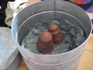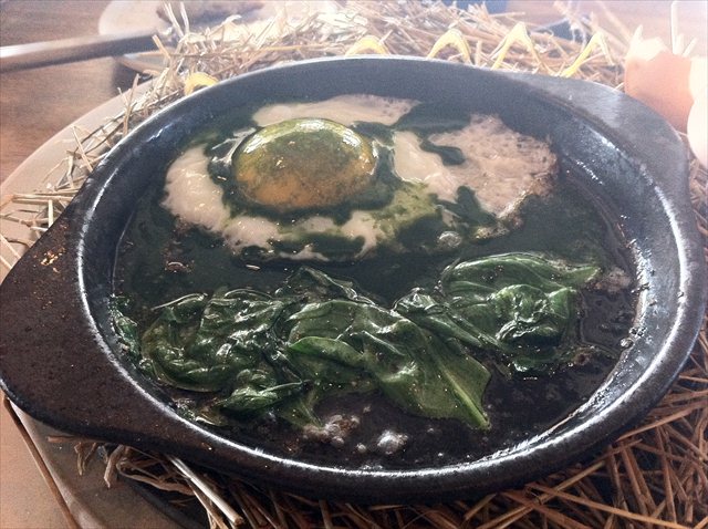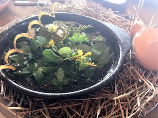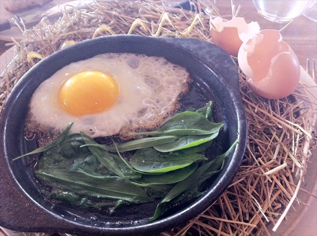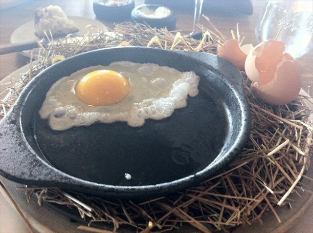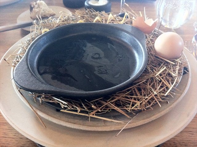 Out come smoking hot ceramic plates, and a bundle of hay. Next to them is an egg.