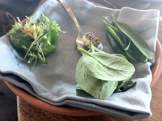 Next there’s a plate of artfully arranged greenery and a lump of seasoned goat’s butter.