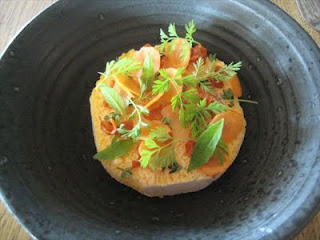 Next is a yogurt mousse, which is as refreshing as a jaunt to a health farm. There’s a pale sunset streaked mousse that’s been frozen like a siezed bath sponge. It’s flavoured with the pricking acidity of sea buckthorn- a ponzu-like native berry. Dotted around the perimeter are carrots, both semi dried and fresh.