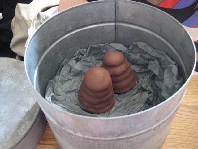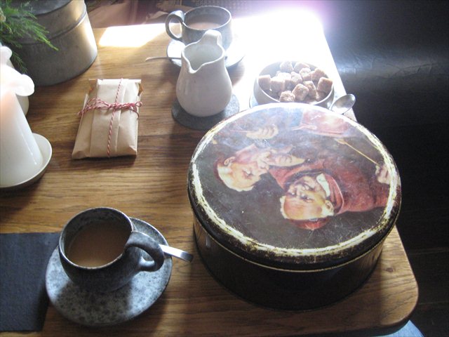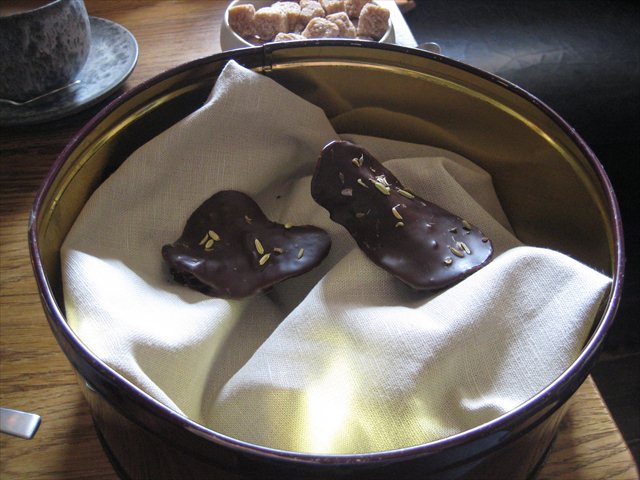 In a large decorated biscuit tin there are chocolate waves, crusted with fennel seeds. They are potato crisps.