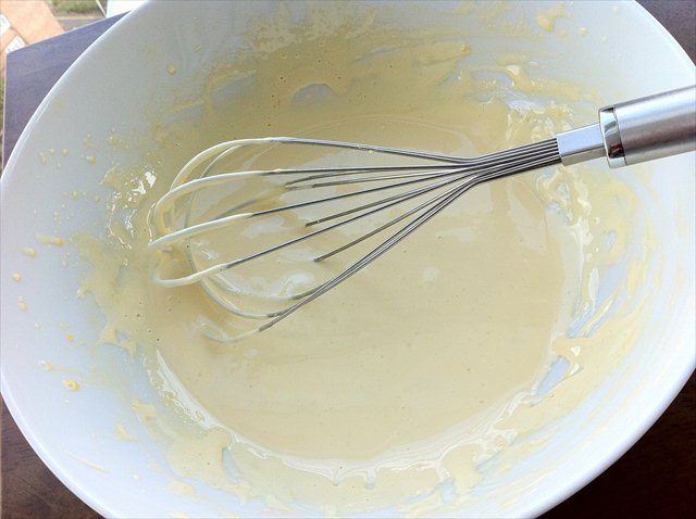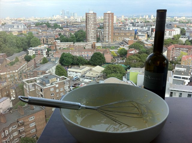 Six minutes and I need to swap arms. In my bowl I’ve now got a blonde blooming bubble of a sauce. There are also couple of beads of sweat on my brow. I could blame the heat of the bain marie, but I think we all know that it’s the exertion.