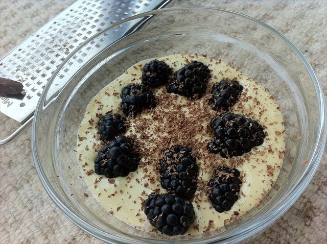 In the bottom of a glass or a bowl crush a handful of blackberries with the back of a fork. Spoon two heaped tablespoons of the sabayon over the top. Then add more blackberries. Then more sabayon. Top with grated dark chocolate.