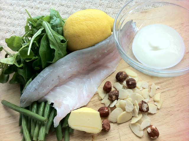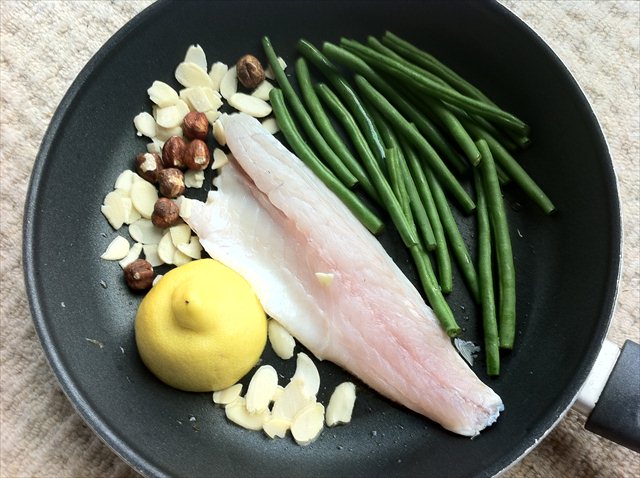 10. Test a bean to make sure they’re cooked to your likeness. Shuffle the beans, nuts and lemon out of the pan and onto the plate.
