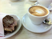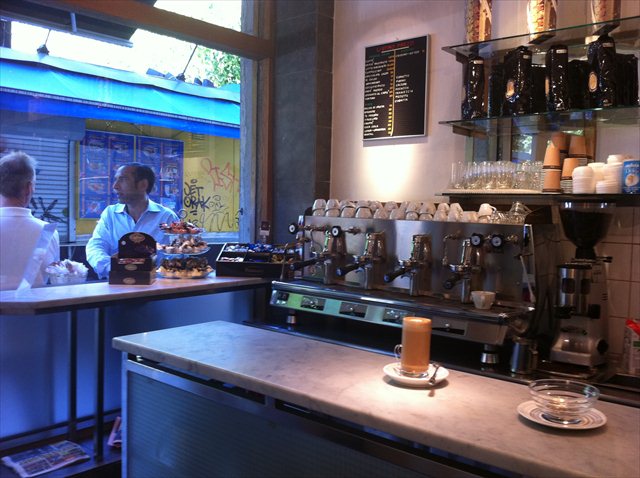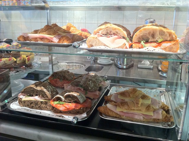 Inside Espresso Sosta is taut space with just enough room for one of you to stand about and sip a coffee while the other makes selections from sandwiches and pastries on display in chilled glass cabinets.