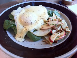 The carbohydrate is a thin slice of gutsy dark danish bread, toasted until it cracks when you break it. It’s generously glossed with butter. Over that are thin slices of salt baked celeriac instead of bacon and baby spinach which still has all of its structural integrity.