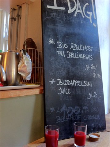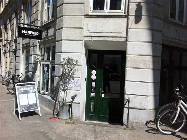 Manfreds is a slightly austere corner building, grey from concrete. The floors are tiled, the benches wood. The main features are the large blackboards which spell out the menu in Danish capitals.