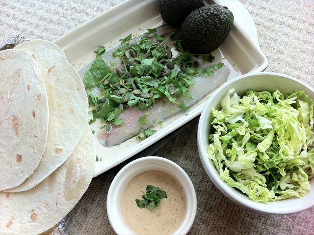 3. Flake each fillet of fish into thirds (keeping the toasted pumpkin seeds and leaves with it). Place the fish on a serving platter with the warm soft tacos, guacamole, shredded cabbage, lime and chipotle crema and jalapenos.