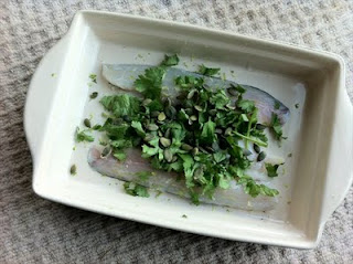 1. Dry the fish fillets well and lay them out in a baking tray. Cover them with a flurry of coriander/cilantro leaves, pumpkin seeds, a drizzle of olive oil and the zest of half a lime (use the juice in the guacamole).