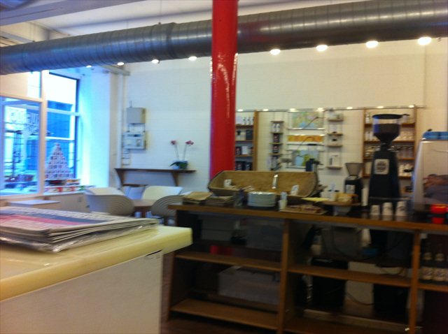 It feels like a cross between a design studio and a workshop. There’s plenty of natural light streaming in from the market street outside and the room is punctuated by fire engine red pillars, artfully weathered cabinets, the day’s newspapers and some serious coffee equipment. There are small round tables flanking the side wall and wide white shell like circular chairs to curl up in (unlike the shirts in East London, these are chairs The Hungry One fits happily in).