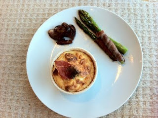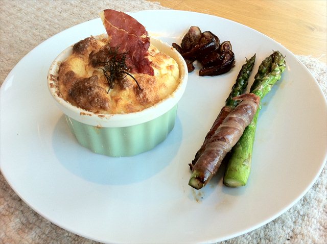 8. Serve with figs that you’ve cooked down with a tablespoon of butter and two tablespoons of vinegar and asparagus spears that have been wrapped in prosciutto and then grilled. I also garnished the top of the cooked soufflés with some extra shards of prosciutto that I’d grilled until crispy.