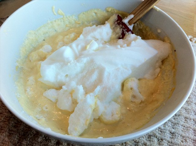 5. Fold one-third of the beaten egg whites into the goat cheese mixture, then fold in the remaining egg whites. Try to keep as much air in the batter as possible.