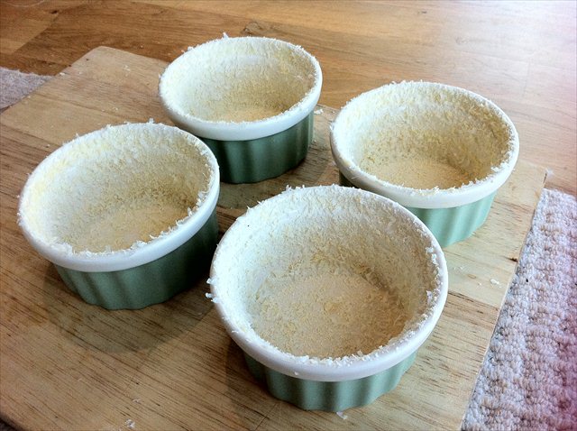 1. Butter the insides of the ramekins. Combine one tablespoons of the parmesan cheese with two tablespoons of ground almonds. Pour it into the base of one of the ramekins and tilt the dish to spread it around the edges. Pour the excess off into the next ramekin. When all of the ramkekins are coated put in the fridge while you make the filling.